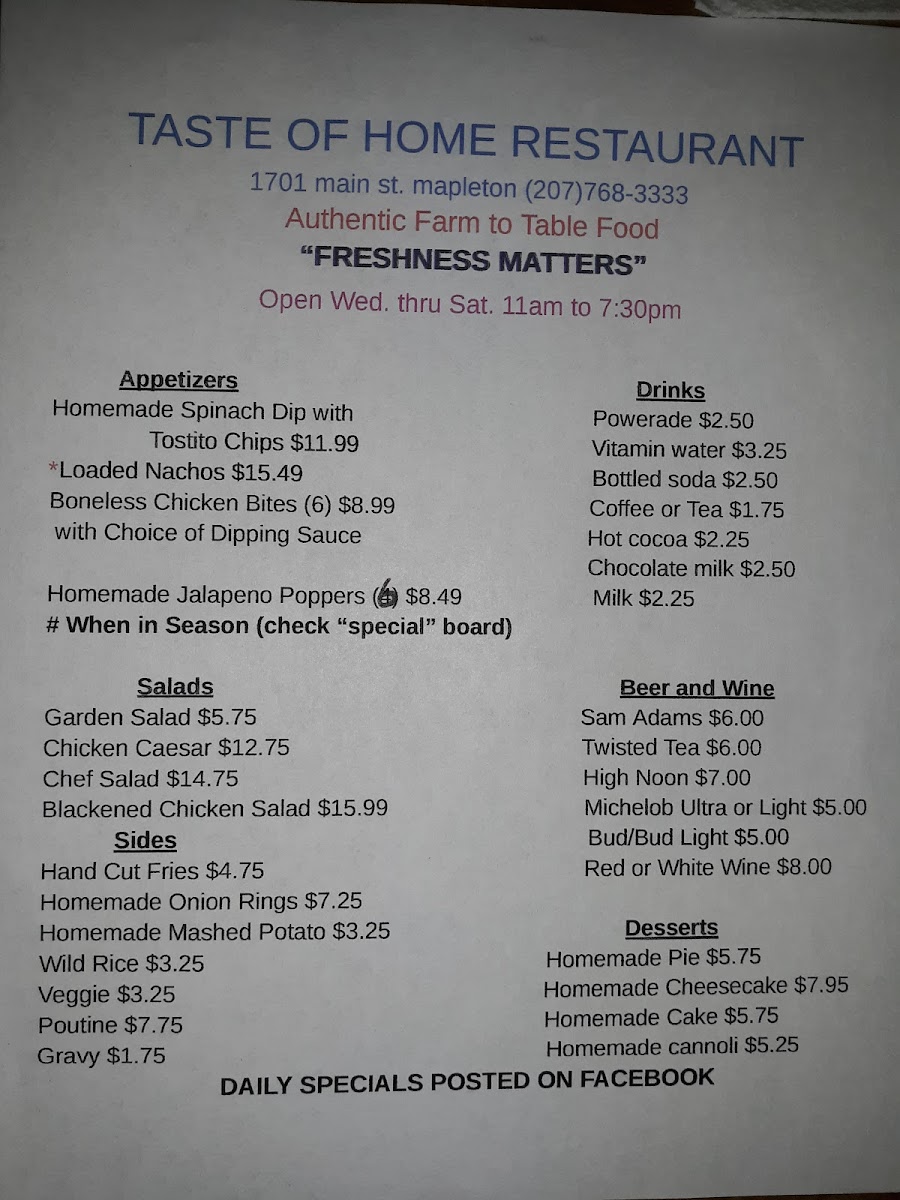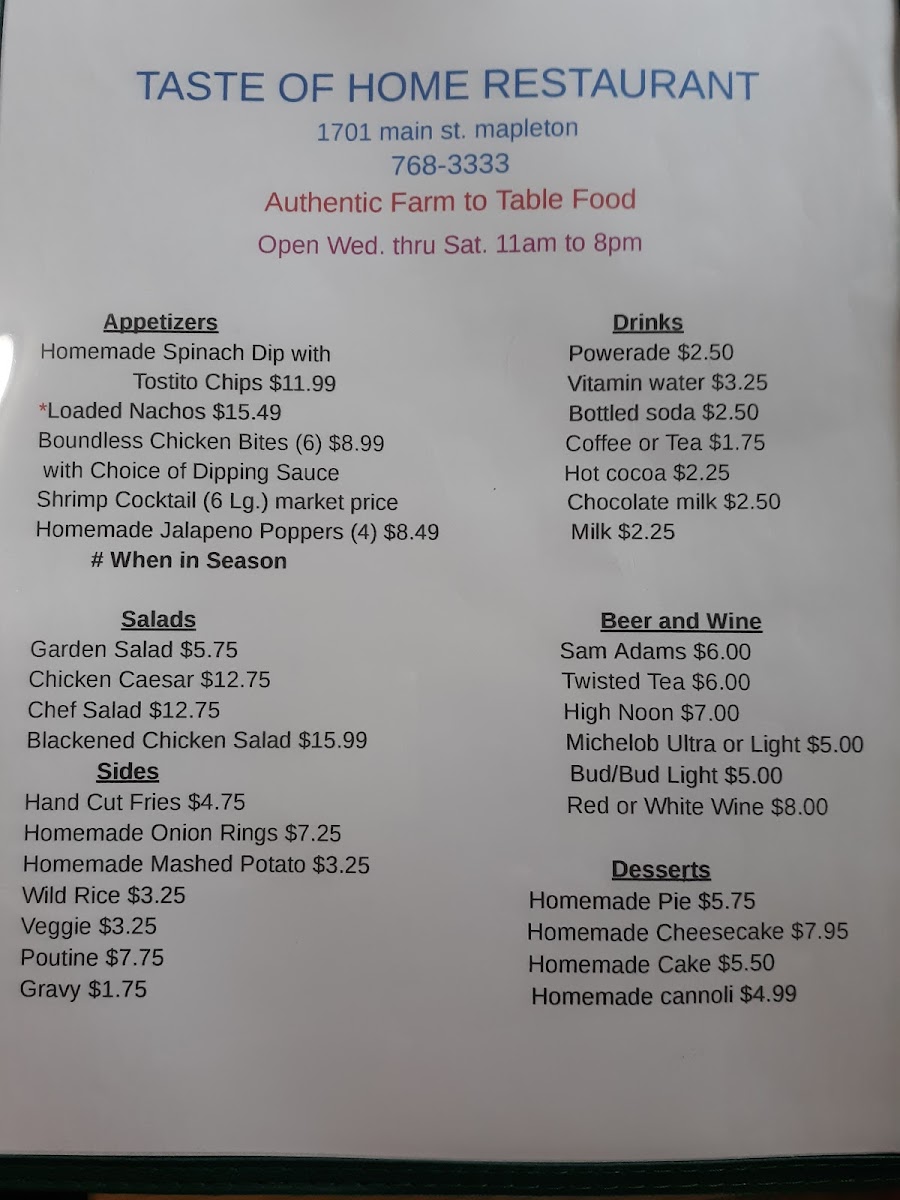 Welcome to Taste of Home restaurant, a charming eatery nestled at 1701 Main St, Mapleton, ME. This delightful spot offers a homey atmosphere where every dish feels like a warm hug. Owners Linda and Eric curate a menu that highlights fresh, locally sourced ingredients, ensuring each meal is both delicious and authentic.